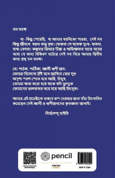 <p>মন তরঙ্গ যা- কিছু পেয়েছি যা আমার হয়নিকো পাওয়া সেই সব কিছু জীবনে হয়না কভু বৃথা। হোকনা সে যতেক দুঃখ- যাতনা ব্যথা-বেদনা। কল্পনার ভিতরে চিন্তা ও অভিজ্ঞতার মাঝে মনের মধ্যে যে কাব্য বিকিরণ ঘটেছে সেই সব নিয়ে আমার দ্বিতীয় কাব্য গ্রন্থ মন তরঙ্গ। হে! পাঠক পাঠিকা জ্ঞানী গুণী জন- তোমরা দিলেগো ঠাঁই মনে জাগিবে মোর সুখ অদৃশ্য পরশ পেতে হয়ে আছি উন্মুখ তোমরা ক্ষমা করো হয়ে থাকে যদি ভুলচুক তোমাদের ভালবাসার তরে হয়ে আছি উৎসুক। আমার এই প্রচেষ্টাকে বাস্তবে রূপ দেওয়ার জন্য যাঁরা উৎসাহিত করেছেন সেই জ্ঞানী ও গুণীজনদের কৃতজ্ঞতা জানাই। নির্মলেন্দু মাইতি</p>