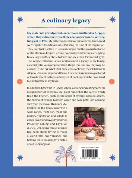 The author was born and brought up in Cairo, Egypt. She was expelled with her family in 1956 as a result of the Suez crisis and came to England as a refugee. Her maternal grandparents were born and lived in Aleppo, which they subsequently left for economic reasons, settling in Egypt in 1910. Her paternal ancestors originated from Toledo and were expelled from Spain in 1492 during the time of the Inquisition. They eventually settled in Constantinople, but the gradual collapse of the Ottoman Empire left them struggling financially and her grandparents chose to leave and seek their fortune in Egypt. The main purpose of writing this book was to transmit to her family a legacy she is proud of and also to share this with a wider audience. Her heritage is a unique blend of three different cultures and styles of cooking, which she has tried to amalgamate in her book. The food of Aleppo is known for its delicacy of seasoning and elaborateness and many dishes have a sweet-and-sour flavour, provided by the balance of citrus fruits, pomegranates, tamarind and dried fruits. Judeo Spanish cooking is relatively simple, with the use mainly of olive oil, lemon juice and very few spices. In addition, the author grew up in Egypt, where cooking and eating were an integral part of everyday life and she still remembers the scents which filled the kitchen, such as the smell of freshly roasted spices, the aroma of orange blossom water and rose petal jam cooking slowly on the stove. There are 260 recipes in the book, covering a wide range, from fish, meat and poultry, vegetarian dishes, soups and salads to cakes, sweet and savoury pastries, Passover baking and authentic Egyptian dishes. Included are many Sephardi favourites, such as borekas, borekitas, pastelles, boyos, bulemas, apio con avas, almodrote de berendjena, albondigas de pishkado, avgolemono soup, prasifutchi, mina de prasa, travados and sansaticos. There are also many Judeo Syrian dishes, such as sweet and tart chicken with apricots, meatballs in apricot sauce, aubergines stuffed with quince, stuffed caramelised onions, kibbeh bil sanieh and okra with prunes and apricots. The Egyptian dishes are what the author remembers her family cooking back in Cairo, from megadarah, molokhehia, lahmah b'ageen, mahshi, koshari, samak b'fereek, filo triangles, roz we hamud, ta'ameyeh, sambusek and dukka, to the classics baklava, konafa, basbousa, Om Ali, Aish ell saraya, menenas and ghorayebah.