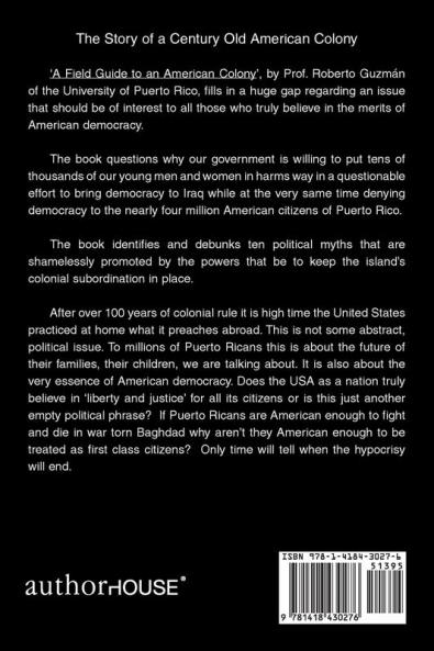 'A Field Guide to an American Colony' by Prof. Roberto Guzmán of the University of Puerto Rico fills in a huge gap regarding an issue that should be of interest to all those who truly believe in the merits of American democracy. The book questions why our government is willing to put tens of thousands of our young men and women in harms way in a questionable effort to bring democracy to Iraq while at the very same time denying democracy to the nearly four million American citizens of Puerto Rico. The book identifies and debunks ten political myths that are shamelessly promoted by the powers that be to keep the island's colonial subordination in place. After over 100 years of colonial rule it is high time the United States practiced at home what it preaches abroad. This is not some abstract political issue. To millions of Puerto Ricans this is about the future of their families their children we are talking about. It is also about the very essence of American democracy. Does the USA as a nation truly believe in 'liberty and justice' for all its citizens or is this just another empty political phrase? If Puerto Ricans are American enough to fight and die in war torn Baghdad why aren't they American enough to be treated as first class citizens? Only time will tell when the hypocrisy will end.