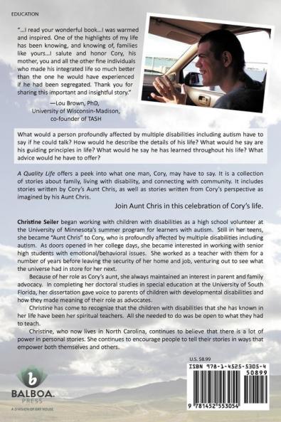 What would a person profoundly affected by multiple disabilities including autism have to say if he could talk? How would he describe the details of his life? What would he say are his guiding principles in life? What would he say he has learned throughout his life? What advice would he have to offer?. A Quality Life offers a peek into what one man, Cory, may have to say. It is a collection of stories about family, living with disability, and connecting with community. It includes stories written by Corys Aunt Chris, as well as stories written from Corys perspective as imagined by his Aunt Chris.. Join Aunt Chris in this celebration of Corys life.. "...I read your book...I was warmed and inspired. One of the highlights of my life has been knowing, and knowing of, families like yours...I salute and honor Cory, his mother, you and all the other fine individuals who made his integrated life so much better than the one he would have experienced if he had been segregated. Thank you for sharing this important and insightful story." Lou Brown, Ph.D., University of Wisconsin-Madison, co-founder of TASH