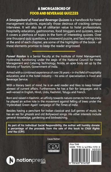 A Smorgasbord of Food and Beverage Quizzes is a handbook for hotel management students especially those desirous of cracking campus interviews. It will also be of utilitarian value to hotel professionals hospitality educators gastronomes food bloggers and quizzers since it covers a plethora of topics in the form of interesting quizzes. Over one thousand quiz questions a crossword puzzle and fascinating trivia at the end of each chapter are some of the highlights of the book - all these elements promise to keep the reader engrossed.