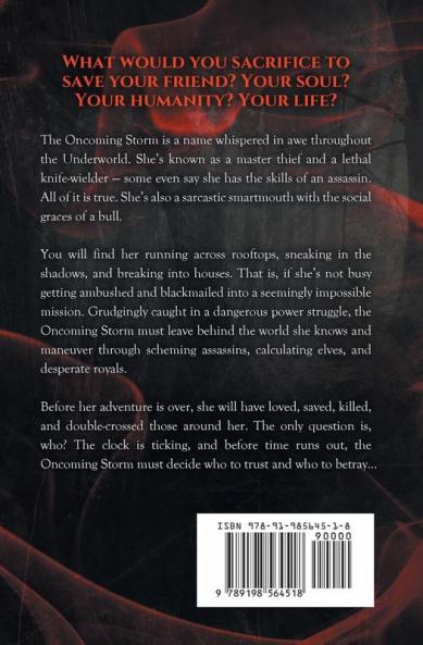 <p><strong>What would you sacrifice to save your friend?</strong></p><p><strong>Your soul? Your humanity? Your life?</strong> </p><p><br></p><p>The Oncoming Storm is a name whispered in awe throughout the Underworld. She's known as a master thief and a lethal knife-wielder - some even say she has the skills of an assassin. All of it is true. She's also a sarcastic smartmouth with the social graces of a bull. </p><p><br></p><p>You will find her running across rooftops sneaking in the shadows and breaking into houses. That is if she's not busy getting ambushed and blackmailed into a seemingly impossible mission. Grudgingly caught in a dangerous power struggle the Oncoming Storm must leave behind the world she knows and maneuver through scheming assassins calculating elves and desperate royals. </p><p><br></p><p>Before her adventure is over she will have loved saved killed and double-crossed those around her. The only question is who? The clock is ticking and before time runs out the Oncoming Storm must decide who to trust and who to betray...</p>