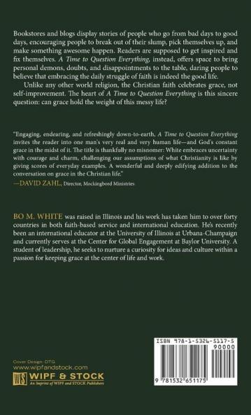 Bookstores and blogs display stories of people who go from bad days to good days encouraging people to break out of their slump pick themselves up and make something awesome happen. Readers are supposed to get inspired and fix themselves. A Time to Question Everything instead offers space to bring personal demons doubts and disappointments to the table daring people to believe that embracing the daily struggle of faith is indeed the good life.Unlike any other world religion the Christian faith celebrates grace not self-improvement. The heart of A Time to Question Everything is this sincere question: can grace hold the weight of this messy life?