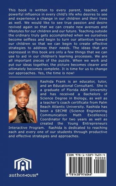 This book is written to every parent teacher and powerful influence in every child's life who desires to see and experience a change in our children and their lives as well. Throughout my life I experienced true passion and ingenuity when it came to my education. I had great teachers who cared and a wonderful support system at home with my parents who emphasized the importance of education. Learning was desired by both the children and the educator. We would like to see this passion and desire revived again so that we can create new avenues and lifestyles for our children and our future. Our children can and will achieve greatness with our help.
