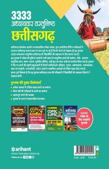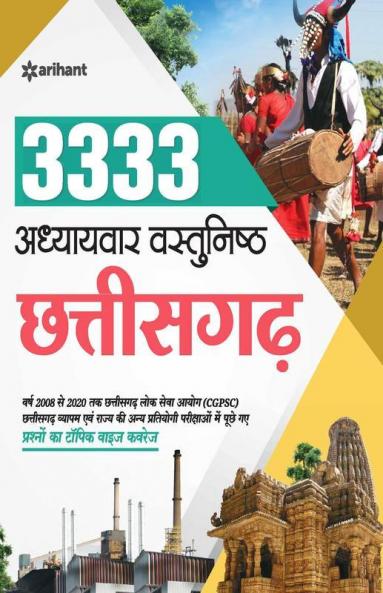 3333 अध्यायवार वस्तुनिष्ठ छत्तीसगढ़छत्तीसगढ़ लोकसेवा आयोग व व्यावसायिक परीक्षा मण्डल द्वारा आयोजित विभिन्न परीक्षाओं में लगातार छत्तीसगढ़ सामान्य ज्ञान से प्रश्न पूछे जा रहे हैं जिनके पैटर्न को देखकर ही इस पुस्तक 3333 अध्यायवार वस्तुनिष्ठ छत्तीसगढ़ को विद्यार्थियों की सहायता के लिए बनाया गया है।इस पुस्तक में परीक्षा की दृष्टि से उपयोगी सभी प्रकार के वस्तुनिष्ठ प्रश्नों की कवरेज ; जैसे- सामान्य वस्तुनिष्ठ प्रश्न कथन- कारण सुमेलित कीजिए सही कूट का चयन आदि का समावेश किया गया है। पुस्तक में दिए गए प्रश्नों की प्रकृति बहुआयामी है जिसमें छत्तीसगढ़ के इतिहास भूगोल अर्थव्यवस्था राजव्यवस्था कला एवं संस्कृति जनजातियाँ पर्यटन आदि से सम्बन्धित अध्यायों को विशेष महत्त्व दिया गया है। हमारा पूर्ण विश्वास है कि यह पुस्तक छत्तीसगढ़ राज्य की परीक्षाओं में विद्यार्थियों को सफलता दिलाने में सहायक होगी।पुस्तक की मुख्य विशेषताएँ</br> प्रत्येक अध्याय में टॉपिक वाइज प्रश्नों का कवरेज</br> विगत वर्षों की परीक्षाओं के प्रश्नों का कवरेज</br> महत्त्वपूर्ण प्रश्नों की व्याख्या</br> पुस्तक के अन्त में समसामयिक घटनाक्रम