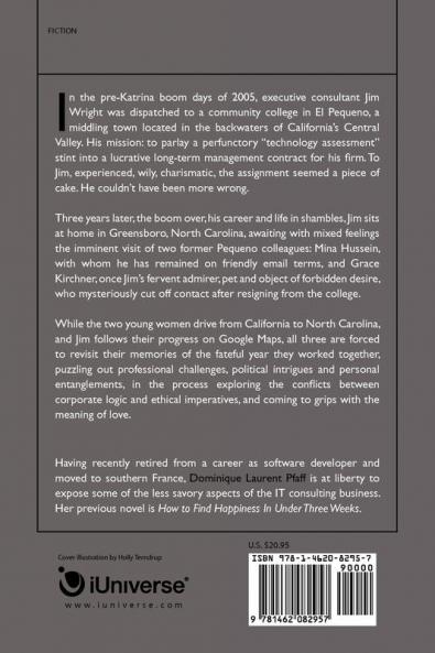 <p>In the pre-Katrina boom days of 2005 executive consultant Jim Wright was dispatched to a community college in El Pequeno a middling town located in the backwaters of California's Central Valley. His mission: to parlay a perfunctory technology assessment stint into a lucrative long-term management contract for his firm. To Jim experienced wily charismatic the assignment seemed a piece of cake. He couldn't have been more wrong.</p><br><p>Three years later the boom over his career and life in shambles Jim sits at home in Greensboro North Carolina awaiting with mixed feelings the imminent visit of two former Pequeno colleagues: Mina Hussein with whom he has remained on friendly email terms and Grace Kirchner once Jim's fervent admirer pet and object of forbidden desire who mysteriously cut off contact after resigning from the college.</p><br><p>While the two young women drive from California to North Carolina and Jim follows their progress on Google Maps all three are forced to revisit their memories of the fateful year they worked together puzzling out professional challenges political intrigues and personal entanglements in the process exploring the conflicts between corporate logic and ethical imperatives and coming to grips with the meaning of love.</p>