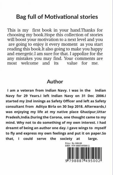 <p>Bag full of Motivational Stories</p><p>This is my first story book which is in your hand. Thanks for choosing my book. Hope this collection of stories book. When you read it will take you to next level of motivation and happiness. Nothing to say more except sorry for any type of mistakes. Better read and give your comments. Your Comments are most valued for my improvement and encouragement. Jai Hind</p>