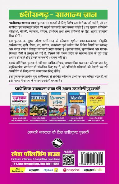 इस अनुपम पुस्तक ‘छत्तीसगढ़ सामान्य ज्ञान’ की रचना विशेष रूप से उन पाठकों के लिए की गई है जो भारत के इस अति-महत्त्वपूर्ण प्रदेश के विषय में विभिन्न कारणों जैसे-प्रतियोगी परीक्षाओं नौकरी व्यवसाय पर्यटन तीर्थाटन अथवा अन्य प्रयोजनों हेतु विस्तृत एवं गहन जानकारी प्राप्त करना चाहते हैं।पुस्तक का प्रमुख उद्देश्य छत्तीसगढ़ से संबंधित व्यापक जानकारी को क्रमबद्ध व्यवस्थित एवं उपयोगी रूप में प्रस्तुत करना है। पुस्तक पूर्णतः सरल एवं पाठक-मित्रवत् रूप में प्रस्तुत की गई है जिससे कि पाठकों को प्रदेश के सामान्य ज्ञान संबंधी सभी पहलुओं से भली प्रकार अवगत करवाया जा सके और उनकी जानकारी को अद्यतन (Up-to-date) बनाया जा सके।पुस्तक इस नवोदित प्रदेश से संबंधित विभिन्न विषयों एवं प्रकरणों की एक इंद्रधनुषी झलक प्रस्तुत करती है। इसमें विभिन्न विषयों पर महत्त्वपूर्ण जानकारियाँ उपलब्ध करवाई गई हैं जैसे-इतिहास भूगोल शासन-व्यवस्था संस्कृति अर्थव्यवस्था कृषि शिक्षा वन पर्यटन जनसंख्या तथा उद्योग आदि। पाठकों को प्रतिस्पर्धा में अन्य प्रतियोगियों से आगे रखने के लिए पुस्तक में नवीनतम व्यक्ति परिचय तथा समसामयिक घटनाक्रम एवं अभ्यास हेतु बहुसंख्य वस्तुनिष्ठ प्रश्नोत्तर भी उपलब्ध करवाए गए हैं।पुस्तक के प्रत्येक पृष्ठ में छत्तीसगढ़ से संबंधित नवीनतम सामान्य ज्ञान का बहु-उपयोगी कोष संचित किया गया है जो यथार्थ ही इसे ‘गागर में सागर’ सिद्ध करेगा।