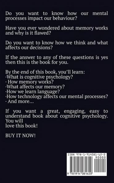 Do you want to know how our mental processes impact our behaviour?Have you ever wondered about memory works and why is it flawed? Do you want to know how we think and what affects our decisions? If the answer to any of these questions is yes then this is the book for you. By the end of this book you'll learn What is cognitive psychology?How memory works?What affects our memory?How we learn language?How technology affects our mental processes?And more...If you want a great engaging easy to understand book about cognitive psychology. You will love this book! BUY IT NOW!Cognitive Psychology Content IntroductionPart One MemoryChapter 1 Introduction to MemoryChapter 2 Retrieval of MemoryChapter 3 Multi-Store Memory ModelChapter 4 Working Memory ModelChapter 5 Reliability of MemoryChapter 6 Episodic MemoryChapter 7 Emotion and MemoryPart Two Decision-Making Thinking and Technology Chapter 8 Decision-Making and ThinkingChapter 9 Visual ImageryChapter 10 Biases in ThinkingChapter 11 Decision Neuroscience Chapter 12 Cognition in A Digital WorldPart Three The Psychology and Neuroscience of LearningChapter 13 Learning Habitual and Basis of LearningChapter 14 Types of Learning Chapter 15 Biology of Learning and MemoryChapter 16 SchemaPart Four Social Cognition Empathy and EmotionChapter 17 Social Cognition Empathy and Mirror NeuronsChapter 18 EmotionChapter 19 Emotion Through A Social Psychology LensChapter 20 Emotion and CognitionChapter 21 How Does Emotion Influence Cognition?Chapter 22 How Does Cognition Influence Emotion?Chapter 23 Does Cognition Cause Emotion?Chapter 24 The Conscious Chapter 25 The Basis of Conscious Part Five Language Chapter 26 Language Chapter 27 How Do We Learn A Language?Part Six Attention Recognition Altered Functions and ControlsChapter 28 AttentionChapter 29 Object Recognition Chapter 30 Facial Recognition Chapter 31 Altered Cognitive Functions and NeuropsychologyChapter 32 Cognitive ControlsBUY NOW!