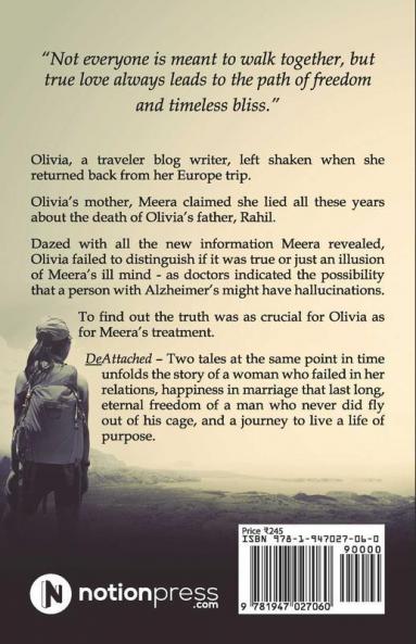 ?Not everyone is meant to walk together but true love always leads to the path of freedom and timeless bliss.? Olivia a traveler blog writer left shaken when she returned back from her Europe trip. Olivia?s mother Meera claimed she lied all these years about the death of Olivia?s father Rahil. Dazed with all the new information Meera revealed Olivia failed to distinguish if it was true or just an illusion of Meera?s ill mind - as doctors indicated the possibility that a person with Alzheimer?s might have hallucinations. To find out the truth was as crucial for Olivia as for Meera?s treatment. DeAttached - Two tales at the same point in time unfolds the story of a woman who failed in her relations happiness in marriage that last long eternal freedom of a man who never did fly out of his cage and a journey to live a life of purpose.