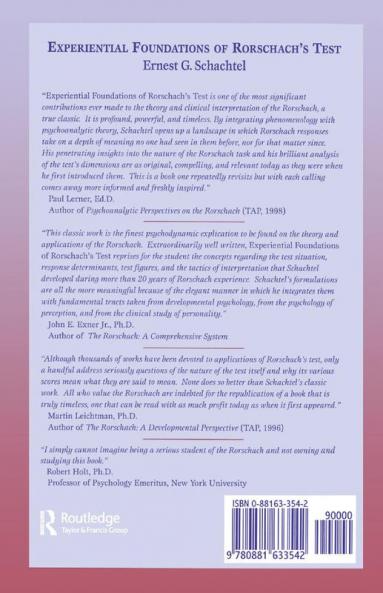 <p>Schachtel shared with his great contemporary David Rapaport the goal of scientifically reframing the psychoanalytic understanding of personality. <i>Experiential Foundations of Rorschach's Test</i> first published in 1966 is in one sense Schachtel's extended dialogue with Rapaport (in the guise of Schachtel's interlocutor) about this ambitious task. In the course of his brilliant and lucid meditation on this topic Schachtel attempted far more than the simple explication of particular test responses. His book contains and should be read as an entire theory of personality considered in terms of the ways in which one person may meaningfully and detectably differ from another.</p>