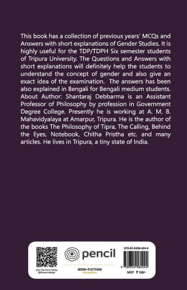<p>This book has a collection of previous years’ MCQs and Answers with short explanations of Gender Studies. It is highly useful for the TDP/TDPH Six semester students of Tripura University. The Questions and Answers with short explanations will definitely help the students to understand the concept of gender and also give an exact idea of the examination. The answers has been also explained in Bengali for Bengali medium students. <br />About Author: Shantaraj Debbarma is an Assistant Professor of Philosophy by profession in Government Degree College. Presently he is working at A. M. B. Mahavidyalaya at Amarpur Tripura. He is the author of the books The Philosophy of Tipra The Calling Behind the Eyes Notebook Chitha Pristha etc. and many articles. He lives in Tripura a tiny state of India.</p>