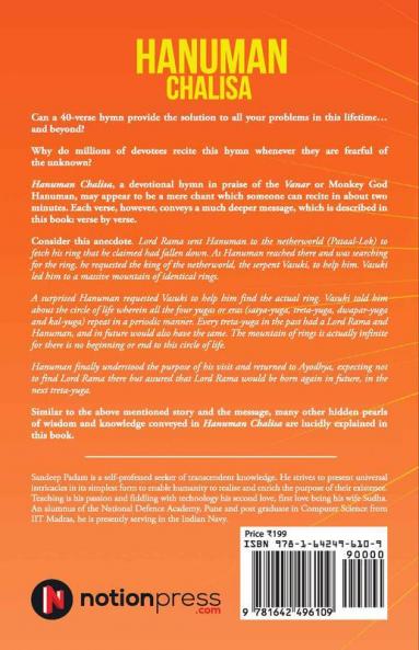 Can a 40-verse hymn provide the solution to all your problems in this lifetime... and beyond? Why do millions of devotees recite this hymn whenever they are fearful of the unknown? Hanuman Chalisa a devotional hymn in praise of the Vanar or Monkey God Hanuman may appear to be a mere chant which someone can recite in about two minutes. Each verse however conveys a much deeper message which is described in this book: verse by verse. Consider this anecdote. Lord Rama sent Hanuman to the netherworld (Pataal-Lok) to fetch his ring that he claimed had fallen down. As Hanuman reached there and was searching for the ring he requested the king of the netherworld the serpent Vasuki to help him. Vasuki led him to a massive mountain of identical rings. A surprised Hanuman requested Vasuki to help him find the actual ring. Vasuki told him about the circle of life wherein all the four yugas or eras (satya-yuga treta-yuga dwapar-yuga and kal-yuga) repeat in a periodic manner. Every treta-yuga in the past had a Lord Rama and Hanuman and in future would also have the same. The mountain of rings is actually infinite for there is no beginning or end to this circle of life. Hanuman finally understood the purpose of his visit and returned to Ayodhya expecting not to find Lord Rama there but assured that Lord Rama would be born again in future in the next treta-yuga. Similar to the above mentioned story and the message many other hidden pearls of wisdom and knowledge conveyed in Hanuman Chalisa are lucidly explained in this book. About the Author Sandeep Padam is a self-professed seeker of transcendent knowledge. He strives to present universal intricacies in its simplest form to enable humanity to realise and enrich the purpose of their existence. Teaching is his passion and fiddling with technology his secondlove firstlovebeing his wife Sudha. An alumnus of the National Defence Academy Pune and post graduate in Computer Science from IIT Madras he is presently serving in the Indian Navy.