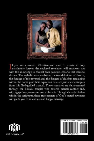 If you are a married Christian and want to remain in holy matrimony forever the enclosed revelation will empower you with the knowledge to combat each possible scenario that leads to divorce. Through this new revelation the true definition of divorce the damage of role reversal and the dangers of children remaining within the home past their expiration date are just a few examples from this God-guided manual. These scenarios are demonstrated through the Biblical couples who entered marital conflict and with agape love overcame every obstacle. Though cleverly hidden within the scriptures these true masters of God's sacred covenant will guide you to an endless and happy marriage.