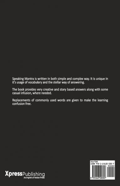 Speaking Mantra is written in both simple and complex way. It is unique in it's usage of vocabulary and the stellar way of answering. The book provides very creative and story based answers along with some casual infusion where needed. Replacements of commonly used words are given to make the learning confusion free.