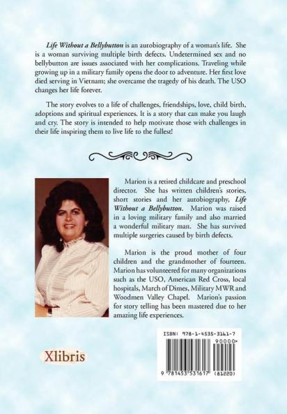 Life Without a Bellybutton is an autobiography of a womanâ s life. She is a woman surviving multiple birth defects. Undetermined sex and no bellybutton are issues associated with her complications. Traveling while growing up in a military family opens the door to adventure. Her first love died serving in Vietnam; she overcame the tragedy of his death. The USO changes her life forever. The story evolves to a life of challenges friendships love child birth adoptions and spiritual experiences. It is a story that can make you laugh and cry. The story is intended to help motivate those with challenges in their life inspiring them to live life to the fullest!