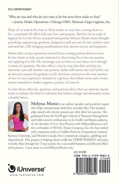 <p>Who are you and who do you want to be has never been made so clear.</p><p>-Jeremy Hodal Operations-Chicago ORD Platinum Cargo Logistics Inc. </p><p>Many of us want it; few have it. Deep inside we may have a strong desire to live a passionate life filled with zest love and purpose. But how do we make it happen? In <i>Live Your Passion</i> seasoned entrepreneur Melyssa Moniz shares thought-provoking empowering questions designed to pull you out of your comfort zone and motivate a life-changing transformation that attracts success and happiness.</p><p>Moniz relies on her experiences derived from creating passion-driven services for her clients to help anyone interested in discovering his or her true passion and applying it to life. She encourages you to listen to your inner voice through a variety of questions. She also offers a step-by-step plan that can help you determine your self-identity and passions define self-esteem and core beliefs use an internal compass for guidance in life decisions and turn to the root emotion of love in every experience. Included is a glossary that defines terms and a bonus section intended to further support a journey of renewal.</p><p><i>Live Your Passion</i> offers key questions and practical advice that can motivate anyone ready to embrace the kind of reflection that induces change and ultimately creates a fruitful future.</p>
