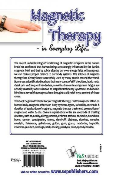 The recent understanding of functioning of magnetic receptors in the human brain has confirmed that human beings are strongly influenced by the Earth's magnetic field and that by subtly altering our own energy fields with magnets we can restore proper balance to our body systems. This science of magneto therapy has already been successfully used by many people around the world. Numerous scientific studies show that many cases of stiff shoulders back neck chest pain and frequent headaches as well as insomnia and general fatigue are actually caused by what is known as Magnetic Deficiency Syndrome and double-blind tests reveal that magnets have brought rapid relief in 90 percent of these cases. This book begins with the history of magnetic therapy Earth's magnetic effect on human body magnetic effects on body systems types suitability methods & duration of application of magnets magneto therapy treatment preparation of magnetized water & oils. Given in alphabetical order are methods of treating diseases such as acidity allergy anemia arthritis asthma backache bronchitis burns cancer constipation cramp dandruff diabetes diarrhea earache eyesight flatulence gall-stones goiter gum gouts headache hepatitis insomnia jaundice lumbago neck obesity paralysis polio spondylosis etc. Contents: 1. Magnetic Therapy . . 5. Effect of Earth’s Magnetic Effect on Human Body . . 10. Classification of Magnetic Materials . . 15. Magnetized Water . . 20. Diseases Cure with Magnetic Therapy . . 25. Amenorrhoea . . 30. Blood Pressure . . 35. Catarrh . . 40. Cramp . . 45. Dyspepsia . . 50. Epilepsy . . 55. Gall-stones . . 60. Height Short . . 65. Hydrocele . . 70. Leucoderma . . 75. Menorrhagia . . 80. Palpitation of Heart . . 85. Poliomyelitis or Polio 86. Spondylosis 87. Tonsillitis 88. Typhoid Fever 89. Urticaria 90. Uterus (Tumours or Inflammation) 91. Vomiting 92. Wounds