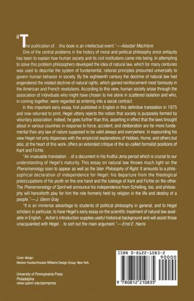 One of the central problems in the history of moral and political philosophy since antiquity has been to explain how human society and its civil institutions came into being. In attempting to solve this problem philosophers developed the idea of natural law which for many centuries was used to describe the system of fundamental rational principles presumed universally to govern human behavior in society. By the eighteenth century the doctrine of natural law had engendered the related doctrine of natural rights which gained reinforcement most famously in the American and French revolutions. According to this view human society arose through the association of individuals who might have chosen to live alone in scattered isolation and who in coming together were regarded as entering into a social contract. In this important early essay first published in English in this definitive translation in 1975 and now returned to print Hegel utterly rejects the notion that society is purposely formed by voluntary association. Indeed he goes further than this asserting in effect that the laws brought about in various countries in response to force accident and deliberation are far more fundamental than any law of nature supposed to be valid always and everywhere. In expounding his view Hegel not only dispenses with the empiricist explanations of Hobbes Hume and others but also at the heart of this work offers an extended critique of the so-called formalist positions of Kant and Fichte.
