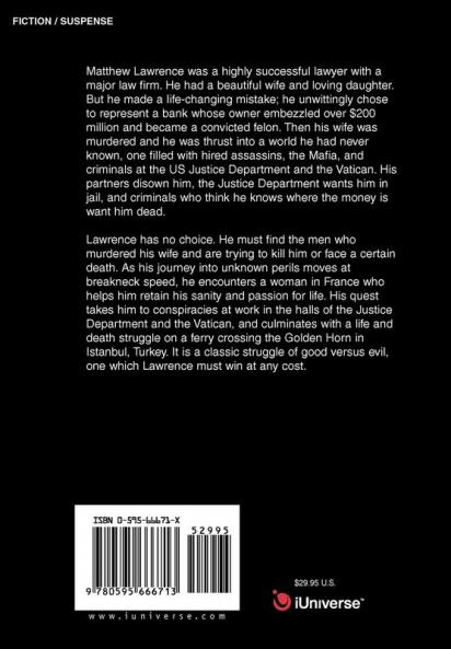 Matthew Lawrence was a highly successful lawyer with a major law firm. He had a beautiful wife and loving daughter. But he made a life-changing mistake; he chose to represent a bank whose owner embezzled over $200 million and became a convicted felon. Then his wife was murdered and he was thrust into a world he had never known one filled with hired assassins the Mafia and criminals at the US Justice Department and the Vatican. His partners disown him the Justice Department wants him in jail and criminals who think he knows where the money is want him dead.</p><p>Lawrence has no choice. He must find and kill the men who murdered his wife and are trying to kill him or face a certain death. As his journey into unknown perils moves at breakneck speed he encounters a woman in France who helps him retain his sanity and passion for life. His quest takes him to conspiracies at work in the halls of the Justice Department and the Vatican and culminates with a life and death struggle on a ferry crossing the Golden Horn in Istanbul Turkey. It is a classic struggle of good versus evil one which Lawrence must win at any cost.</p>