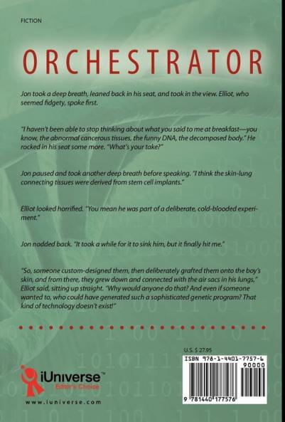 Dr. Jonathan Drake is accustomed to seeing dead people but nothing like the deformed corpse lying on his autopsy table-its thick and scaly skin rendering the physical features unrecognizable. Worst of all the body belongs to a nine-year-old boy.<p> The young boy's bizarre death leads Dr. Drake along with Federal Agent Mona Larsen to investigate a prominent surgeon's unethical search for a cancer cure. As they uncover one death after another Drake and Larsen soon realize their lives are in danger when they discover that the biotech sector and United States military are involved in the experimentation. After a series of startling discoveries they learn that the affected children have been implanted with stem cells containing a robust species of DNA which has orchestrated their genomes into a cancerous state. Ironically this same orchestrator DNA is able to cure all types of cancer as well.<p> As Drake doggedly pursues this master cure his competition surfaces when Dr. David Kreeger a biotech CEO and pediatric surgeon reveals he is also seeking the cure. When Drake confronts Kreeger he is faced with a difficult choice-one that tests just how far he will go to realize his own dreams and ambitions.