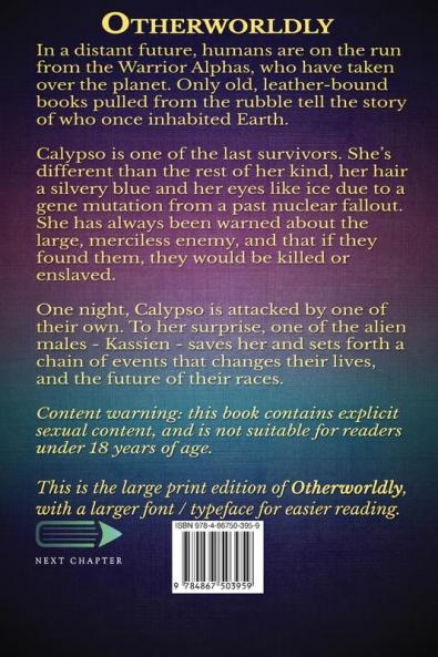 <p>In a distant future humans are on the run from the Warrior Alphas who have taken over the planet. Only old leather-bound books pulled from the rubble tell the story of who once inhabited Earth.</p><p>Calypso is one of the last survivors. She's different than the rest of her kind her hair a silvery blue and her eyes like ice due to a gene mutation from a past nuclear fallout. She has always been warned about the large merciless enemy and that if they found them they would be killed or enslaved.</p><p>One night Calypso is attacked by one of their own. To her surprise&nbsp;one of the alien males - Kassien - saves her and sets forth a chain of events that changes their lives and the future of their races.</p><p><em>Content warning: this book contains explicit sexual content and is not suitable for readers under 18 years of age. This is the large print edition of Otherworldly with a larger font / typeface for easier reading.</em></p>