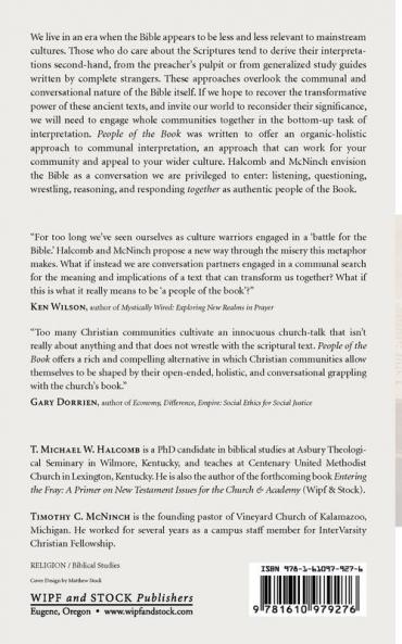 Synopsis: We live in an era when the Bible appears to be less and less relevant to mainstream cultures. Those who do care about the Scriptures tend to derive their interpretations secondhand from the preachers pulpit or from generalized study guides written by complete strangers. These approaches overlook the communal and conversational nature of the Bible itself. If we hope to recover the transformative power of these ancient texts and invite our world to reconsider their significance we will need to engage whole communities together in the bottom-up task of interpretation. People of the Book was written to offer an organic-holistic approach to communal interpretation an approach that can work for your community and appeal to your wider culture. Halcomb and McNinch envision the Bible as a conversation we are privileged to enter: listening questioning wrestling reasoning and responding together as authentic people of the Book. Endorsements: For too long weve seen ourselves as culture warriors engaged in a battle for the Bible. Halcomb and McNinch propose a new way through the misery this metaphor makes. What if instead we are conversation partners engaged in a communal search for the meaning and implications of a text that can transform us together? What if this is what it really means to be a people of the book? --Ken Wilson Author of Mystically Wired: Exploring New Realms in Prayer Too many Christian communities cultivate an innocuous church-talk that isnt really about anything and that does not wrestle with the scriptural text. People of the Book offers a rich and compelling alternative in which Christian communities allow themselves to be shaped by their open-ended holistic and conversational grappling with the churchs book. --Gary J. Dorrien Author of Economy Difference Empire: Social Ethics for Social Justice Author Biography: T. Michael W. Halcomb is a PhD candidate in biblical studies at Asbury Theological Seminary in Wilmore Kentucky and teaches at Centenary United Methodist Church in Lexington Kentucky. He is also the author of the forthcoming book Entering the Fray: A Primer on New Testament Issues for the Church & Academy (Wipf & Stock). Timothy McNinch is the founding pastor of Vineyard Church of Kalamazoo Michigan. He worked for several years as a campus staff member for InterVarsity Christian Fellowship.