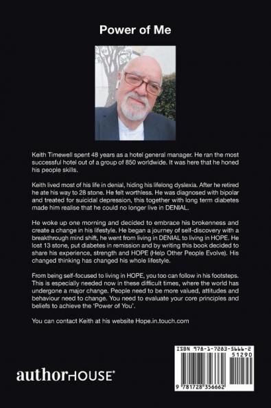 This book is designed to aid readers to create an mind shift of change in their thinking by interactivity using the personal touch sheet after each chapter to make a commitment to update what they want to start doing and what they want to stop doing this over ten chapter building a mind map to change thinking in line with the massive change happening throughout the world as result of darkest time we ever had to endure going through change the world as we've know it to met the future changes Power f Me . Will carry a message of hope a journey of self discovery to reveal who you truly are that the mind shifts from living in denial to living in hope. The chapters share the author's experience strength and hope and by an ongoing unique formula designed to monitor growth called 3 circles for life. Then ultimately change your life and thinking will switch from thinking what is the worst thing could happento thinking what would be the best results a mind shift to experience a new way of thinking and start living in hope with each chapter being food for thought to empowering you in these difficult times let go of your fears and anxiety and having the love respect and appreciation for other and for yourselves will give you the freedom to reach your true self start living in hope having taken back you life by achievement of the Power of you.