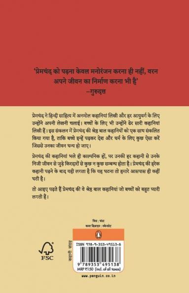 इस संग्रह में प्रेमचन्द की उन कहानियों को सगृहित किया गया है जो बच्चों को बहुत प्यरी लगती हैं। इस संग्रह में सभी श्रेष्ठ बाल कहानियों को एक साथ संग्रहित किया गया है ताकि बच्चे इन्हें पढ़कर देश व धर्म के लिए कुछ ऐसा करें जिससे उनका जीवन धन्य हो जाए। सभी कहानियों की भाषा अत्यंत सरल और धाराप्रवाह है| About the Author प्रेमचन्द हिन्दी और उर्दू के महानतम भारतीय लेखकों में से एक हैं। मूल नाम धनपत राय श्रीवास्तव प्रेमचंद को नवाब राय और मुंशी प्रेमचंद के नाम से भी जाना जाता है। वे एक संवेदनशील लेखक सचेत नागरिक कुशल वक्ता तथा सुधी (विद्वान) संपादक थे। प्रेमचंद ने हिन्दी कहानी और उपन्यास की एक ऐसी परंपरा का विकास किया जिसने पूरी सदी के साहित्य का मार्गदर्शन किया|