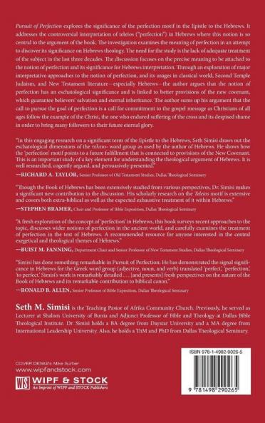 Pursuit of Perfection explores the significance of the perfection motif in the Epistle to the Hebrews. It addresses the controversial interpretation of teleios (perfection) in Hebrews where this notion is so central to the argument of the book. The investigation examines the meaning of perfection in an attempt to discover its significance on Hebrews theology. The need for the study is the lack of adequate treatment of the subject in the last three decades. The discussion focuses on the precise meaning to be attached to the notion of perfection and its significance for Hebrews interpretation. Through an exploration of major interpretative approaches to the notion of perfection and its usages in classical world Second Temple Judaism and New Testament literature especially Hebrews. The author argues that the notion of perfection has an eschatological significance and is linked to better provisions of the new covenant which guarantee believers salvation and eternal inheritance. The author sums up his argument that the call to pursue the goal of perfection is a call for commitment to the gospel message as Christians of all ages follow the example of the Christ the one who endured suffering of the cross and its despised shame in order to bring many followers to their future eternal glory. In this engaging research on a significant term of the Epistle to the Hebrews Seth Simisi draws out the eschatological dimensions of the τελειο- word group as used by the author of Hebrews. He shows how the perfection motif points to a future fulfillment that is connected to provisions of the New Covenant. This is an important study of a key element for understanding the theological argument of Hebrews. It is well researched cogently argued and persuasively presented. --Richard A. Taylor Senior Professor of Old Testament Studies Dallas Theological Seminary Though the Book of Hebrews has been extensively studied from various perspectives Dr. Simisi makes a significant new contribution to the discussion. His scholarly research on the Tvevleio motif is extensive and covers both extra-biblical as well as the expected exhaustive treatment of it within Hebrews. --Stephen Bramer Chair and Professor of Bible Exposition Dallas Theological Seminary A fresh exploration of the concept of perfection in Hebrews this book surveys recent approaches to the topic discusses wider notions of perfection in the ancient world and carefully examines the treatment of perfection in the text of Hebrews. A recommended resource for anyone interested in the central exegetical and theological themes of Hebrews. --Buist M. Fanning Department Chair and Senior Professor of New Testament Studies Dallas Theological Seminary Simisi has done something remarkable in Pursuit of Perfection: He has demonstrated the signal significance in Hebrews for the Greek word group (adjective noun and verb) translated perfect perfection to perfect. Simisis work is remarkably detailed . . . [and presents] fresh perspectives on the nature of the Book of Hebrews and its remarkable contribution to biblical canon. --Ronald B. Allen Senior Professor of Bible Exposition Dallas Theological Seminary Seth Muhesi Simisi is the Teaching Pastor of Afrika Community Church. Previously he served as Lecturer at Shalom University of Bunia and Adjunct Professor of Bible and Theology at Dallas Bible Theological Institute. Dr. Simisi holds a BA degree from Daystar University and MA degree from International Leadership University. Also he holds a ThM and PhD from Dallas Theological Seminary.