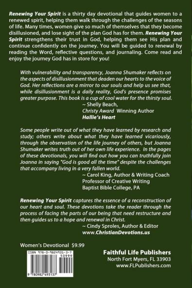 Renewing Your Spirit is a thirty day devotional that guides women to a renewed spirit helping them walk through the challenges of the seasons of life. Many times women give so much of themselves that they become disillusioned and lose sight of the plan God has for them. Renewing Your Spirit strengthens their trust in God helping them see His plan and continue confidently on the journey. You will be guided to renewal by reading the Word reflective questions and journaling. Come read and enjoy the journey God has in store for you!