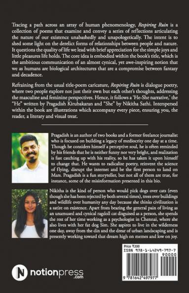 Tracing a path across an array of human phenomenology Respiring Ruin is a collection of poems that examine and convey a series of reflections articulating the nature of our existence unabashedly and unapologetically. The intent is to shed some light on the derelict forms of relationships between people and nature. It questions the quality of life we lead with brief appreciation for the simple joys and little pleasures life holds. The core idea is embodied within the book's title which is the ambitious communication of an almost cynical yet awe-inspiring notion that we as humans are biological architectures that are a compromise between fantasy and decadence. Refraining from the usual title-poem caricature Respiring Ruin is dialogue poetry where two people explore not just their own but each other's thoughts addressing the masculine and feminine perspectives. Hence it follows a 'He-She narrative ' the "He" written by Pragadish Kirubakaran and "She" by Nikitha Sathi. Interspersed within the book are illustrations which accompany every piece ensuring you the reader a literary and visual treat. About the Author Pragadish is an author of two books and a former freelance journalist who is focused on building a legacy of mediocrity one day at a time. Though he considers himself a perceptive soul he is often reminded by his friends that he is neither funny nor very bright and realization is fast catching up with his reality so he has taken it upon himself to change that. He wants to radicalize poetry reinvent the science of flying disrupt the internet and be the first person to land on Mars. Pragadish is a fun storyteller but not all of them are true for instance some of the misinformation presented in this bio. Nikitha is the kind of person who would pick dogs over cats (even though she has been rejected by both several times) trees over buildings and wildlife over humanity any day because she thinks civilization is a satire on existence. Apart from bearing the general pain of living as an unamused and cynical ragdoll cat disguised as a person she spends the rest of her time working as a psychologist in Chennai where she also lives with her fat dog Sim. She aspires to live in the wilderness one day away from the din and the drear of urban landscaping and is presently working toward that dream high on memes and low on joy