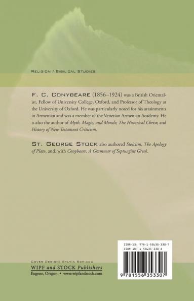 F.C. Conybeare (1856-1924) was a British Orientalist Fellow of University College Oxford and Professor of Theology at the University of Oxford. He was particularly noted for his attainments in Armenian and was a member of the Venetian Armenian Academy. He is also the author of Myth Magic and Morals; The Historical Christ; and History of New Testament Criticism. George Stock also authored Stoicism The Apology of Plato and with Conybeare A Grammar of Septuagint Greek.