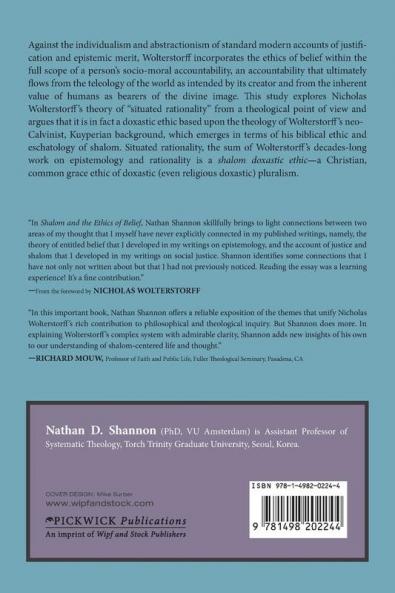 Against the individualism and abstractionism of standard modern accounts of justification and epistemic merit Wolterstorff incorporates the ethics of belief within the full scope of a persons socio-moral accountability an accountability that ultimately flows from the teleology of the world as intended by its creator and from the inherent value of humans as bearers of the divine image. This study explores Nicholas Wolterstorffs theory of situated rationality from a theological point of view and argues that it is in fact a doxastic ethic based upon the theology of Wolterstorffs neo-Calvinist Kuyperian background which emerges in terms of his biblical ethic and eschatology of shalom. Situated rationality the sum of Wolterstorffs decades-long work on epistemology and rationality is a shalom doxastic ethic--a Christian common grace ethic of doxastic (even religious doxastic) pluralism. In Shalom and the Ethics of Belief Nathan Shannon skillfully brings to light connections between two areas of my thought that I myself have never explicitly connected in my published writings namely the theory of entitled belief that I developed in my writings on epistemology and the account of justice and shalom that I developed in my writings on social justice. Shannon identifies some connections that I have not only not written about but that I had not previously noticed. Reading the essay was a learning experience! Its a fine contribution. --From the foreword by Nicholas Wolterstorff In this important book Nathan Shannon offers a reliable exposition of the themes that unify Nicholas Wolterstorffs rich contribution to philosophical and theological inquiry. But Shannon does more. In explaining Wolterstorffs complex system with admirable clarity Shannon adds new insights of his own to our understanding of shalom-centered life and thought. --Richard Mouw Professor of Faith and Public Life Fuller Theological Seminary Pasadena CA Nathan D. Shannon (PhD VU Amsterdam) is Assistant Professor of Systematic Theology Torch Trinity Graduate University Seoul Korea.