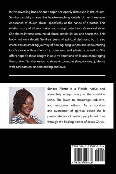 Can a community you call church cause pain? What if you could not give language to what you experienced? Can you even describe what you are going through? Some will say that its just a little church hurt and you should not take it personally. The truth is you might be a victim of spiritual abuse and not know it. This book takes you on a journey of Sandras experience in a cult disguised as a modern-day church. The uncensored accounts of abuse on the pages of this book unmask the manipulative tactics used by individuals who call themselves church leaders. The valuable insight on spiritual abuse through her experience is a guide to freedom. The trauma may seem debilitating but on the other side of that pain healing is possible. This book is packed with examples of emotional psychological and even physical abuse. Sandras journey from victim to survivor to overcomer will bring you clarity that encourages you to take back your freedom through the healing power of Jesus Christ.