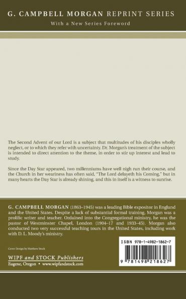 The Second Advent of our Lord is a subject that multitudes of his disciples wholly neglect or to which they refer with uncertainty. Dr. Morgans treatment of the subject is intended to direct attention to the theme in order to stir up interest and lead to study. Since the Day Star appeared two millenniums have well nigh run their course and the Church in her weariness has often said The Lord delayeth his Coming but in many hearts the Day Star is already shining and this in itself is a witness to sunrise. G. Campbell Morgan (1863-1945) was a leading Bible expositor in England and the United States. Despite a lack of substantial formal training Morgan was a prolific writer and teacher. Ordained into the Congregational ministry he was the pastor of Westminster Chapel London (1904-17 and 1933-45). Morgan also conducted two very successful teaching tours in the United States including work with D. L. Moodys ministry.
