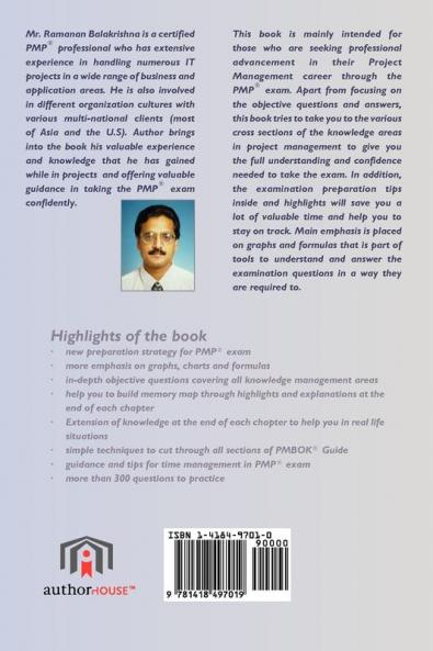 This Book Is Mainly Intended For Those Who Are Seeking Professional Advancement In Their Project Management Career Through The Pmp(R) Exam. Apart From Focusing On The Objective Questions And Answers This Book Tries To Take You To The Various Cross Sections Of The Knowledge Areas In Project Management To Give You The Full Understanding And Confidence Needed To Take The Exam. In Addition The Examination Preparation Tips Inside And Highlights Will Save You A Lot Of Valuable Time And Help You To Stay On Track. Main Emphasis Is Placed On Graphs And Formulas That Is Part Of Tools To Understand And Answer The Examination Questions In A Way They Are Required To.
