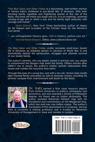 The Blue Salon And Other Follies Vividly Recounts The 1930'S Childhood Of Vernon Katz In Lippe Germany. Through The Eyes Of An Observant Young Boy The Author Reveals How Jewish Life In A Country Town Gradually Eroded As The Nazis Came To Power. With A Dry Wit The Author Recaptures His Childhood And Family Life Through Light-Hearted Anecdotes And Pictures As Well As Dramatic Events Including His Mother'S Escapes From Imprisonment And Death By The Nazis. The Title The Blue Salon And Other Follies Refers To The Inability Of Vernon Katz'S Parents In The Early Years Of Nazi Rule To Comprehend The Dangers That Lie Ahead. Rooted In German Soil And Having Built A Successful Brush Factory Together They Think It Is All A Passing Phase. Fifteen Months After Hitler'S Rise To Power When A Tribute To Vernon Katz' Father Appears In A German Business Journal His Mother Joyfully Redecorates The House And Creates The Luxurious Blue Salon. When The Nuremberg Laws Are Enacted The Situation Darkens. Vernon Katz At Age Ten Is Stoned Persecuted And Terrified By His Nazi Teachers. Ultimately On Kristallnacht The Author'S Father Is Imprisoned At The Buchenwald Concentration Camp. The Family Doctor Sends Mrs. Katz To A Mental Institution To Protect Her From The Gestapo. As The Nazis Grow Even More Insidious The Family Must Take Desperate Measures To Try To Save Themselves. The Blue Salon And Other Follies Lovingly Recreates Small-Town Jewish Life In Germany Before World War Ii And Dramatically Depicts The Persecution Struggles And Ultimate Survival Of One Jewish Family. A Literary Gem And An Unforgettable ReadThe Blue Salon And Other Follies Will Make You Laugh And Cry. It Is A Universal Coming-Of-Age Tale In Which A Boy Fights Adversity With Courage And Humor.