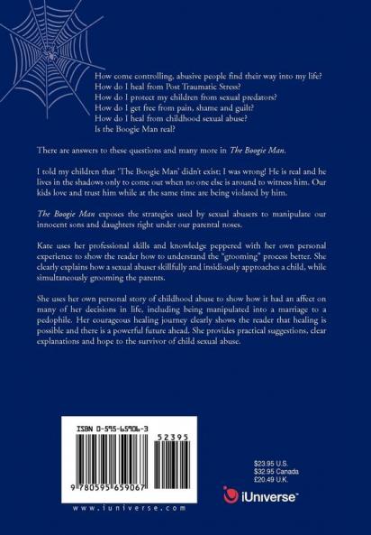 How Come Controlling Abusive People Find Their Way Into My Life? How Do I Heal From Post Traumatic Stress? How Do I Protect My Children From Sexual Predators? How Do I Get Free From Pain Shame And Guilt? How Do I Heal From Childhood Sexual Abuse? Is The Boogie Man Real? There Are Answers To These Questions And Many More In 'The Boogie Man'. I Told My Children That 'The Boogie Man' Didn'T Exist; I Was Wrong! He Is Real And He Lives In The Shadows Only To Come Out When No One Else Is Around To Witness Him. Our Kids Love And Trust Him While At The Same Time Are Being Violated By Him. 'The Boogie Man' Exposes The Strategies Used By Sexual Abusers To Manipulate Our Innocent Sons And Daughters Right Under Our Parental Noses. Kate Uses Her Professional Skills And Knowledge Peppered With Her Own Personal Experience To Show The Reader How To Understand The Grooming Process Better. She Clearly Explains How A Sexual Abuser Skillfully And Insidiously Approaches A Child While Simultaneously Grooming The Parents. She Uses Her Own Personal Story Of Childhood Abuse To Show How It Had An Affect On Many Of Her Decisions In Life Including Being Manipulated Into A Marriage To A Pedophile. Her Courageous Healing Journey Clearly Shows The Reader That Healing Is Possible And There Is A Powerful Future Ahead. She Provides Practical Suggestions Clear Explanations And Hope To The Survivor Of Child Sexual Abuse.