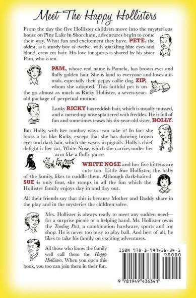 The adventures for the hollisters begin as soon as they move into their new house on the shore on pine lake in shoreham. first, the moving van carrying their toys and their father's important new invention disappears. next, they learn that their house may be haunted, with a treasure hidden somewhere inside! right away they all set out to solve these mysteries. each one of the hollister children pete (age 12), pam (10), ricky (7), holly (6) and sue (4) plays an important role in finding clues, along with their parents who are always ready to join in on the excitement. even zip, the collie, and white nose, the cat, are part of the family, and find thrilling adventures of their own. as the hollisters explore their new town and make friends, they discover what happened to the moving van, and learn more about the mystery surrounding their new home. excitement abounds when a secret stairway is discovered. then, on the trail of a mysterious intruder, their chase leads them to a deserted hut on nearby blackberry island. over seventy action-packed illustrations make the story-and the hollister family-so vivid that the reader has a feeling of really sharing in on the adventures of this lovable and interesting family.paperback; 186 pages with over 70 illustrations.