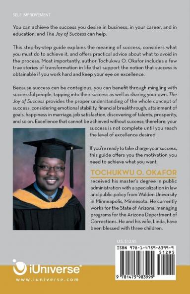 <p>You can achieve the success you desire in business in your career and in education and <em>The Joy of Success</em> can help.</p> <p>This step-by-step guide explains the meaning of success considers what you must do to achieve it and offers practical advice about what to avoid in the process. Most importantly author <strong>Tochukwu O. Okafor</strong> includes a few true stories of transformation in life that support the notion that success is obtainable if you work hard and keep your eye on excellence.</p> <p>Because success can be contagious you can benefit through mingling with successful people tapping into their success as well as sharing your own. The Joy of Success provides the proper understanding of the whole concept of success considering emotional stability financial breakthrough attainment of goals happiness in marriage job satisfaction discovering of talents prosperity and so on. Excellence that cannot be achieved without success; therefore your success is not complete until you reach the level of excellence desired.</p> <p>If you&rsquo;re ready to take charge your success this guide offers you the motivation you need to achieve what you want.</p>