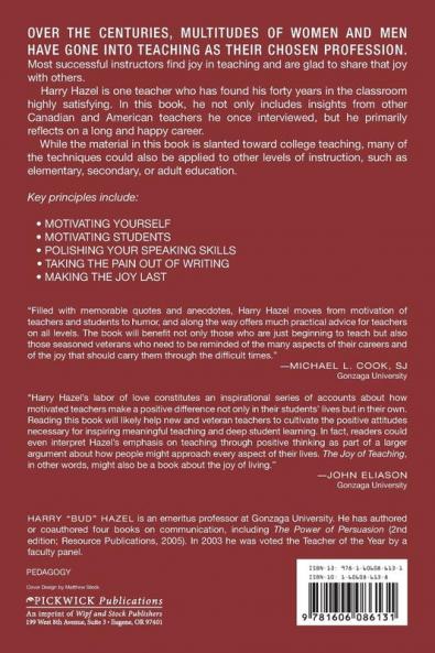 Over the centuries multitudes of women and men have gone into teaching as their chosen profession. Most successful instructors find joy in teaching and are glad to share that joy with others. Harry Hazel is one teacher who has found his forty years in the classroom highly satisfying. In this book he not only includes insights from other Canadian and American teachers he once interviewed but he primarily reflects on a long and happy career. While the material in this book is slanted toward college teaching many of the techniques could also be applied to other levels of instruction such as elementary secondary or adult education. Key principles include Motivating yourself Motivating students Polishing your speaking skills Taking the pain out of writing Making the joy last Filled with memorable quotes and anecdotes Harry Hazel moves from motivation of teachers and students to humor and along the way offers much practical advice for teachers on all levels. The book will benefit not only those who are just beginning to teach but also those seasoned veterans who need to be reminded of the many aspects of their careers and of the joy that should carry them through the difficult times. --Michael L. Cook SJ Gonzaga University Harry Hazels labor of love constitutes an inspirational series of accounts about how motivated teachers make a positive difference not only in their students lives but in their own. Reading this book will likely help new and veteran teachers to cultivate the positive attitudes necessary for inspiring meaningful teaching and deep student learning. In fact readers could even interpret Hazels emphasis on teaching through positive thinking as part of a larger argument about how people might approach every aspect of their lives. The Joy of Teaching in other words might also be a book about the joy of living. --John Eliason Gonzaga University Harry Bud Hazel is an emeritus professor at Gonzaga University. He has authored or coauthored four books on communication including The Power of Persuasion (2nd edition; Resource Publications 2005). In 2003 he was voted the Teacher of the Year by a faculty panel.