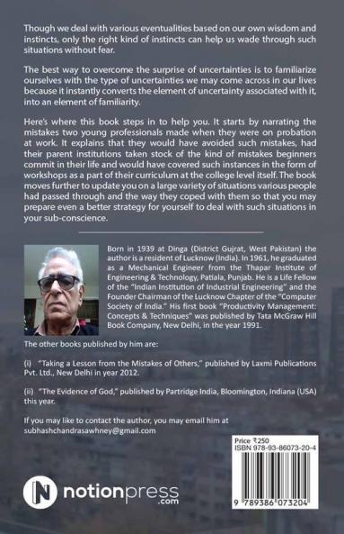 Though we deal with various eventualities based on our own wisdom and instincts only the right kind of instincts can help us wade through such situations without fear. The best way to overcome the surprise of uncertainties is to familiarize ourselves with the type of uncertainties we may come across in our lives because it instantly converts the element of uncertainty associated with it into an element of familiarity.Heres where this book steps in to help you. It starts by narrating the mistakes two young professionals made when they were on probation at work. It explains that they would have avoided such mistakes had their parent institutions taken stock of the kind of mistakes beginners commit in their life and would have covered such instances in the form of workshops as a part of their curriculum at the college level itself. The book moves further to update you on a large variety of situations various people had passed through and the way they coped with them so that you may prepare even a better strategy for yourself to deal with such situations in your sub-conscience.