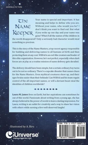 Your name is special and important. It has meaning and helps to define who you are. Without your name who would you be? I don't think you want to find out! But what if you woke up one day and your name was gone? What if all the names of the children in the world disappeared? Only a seriously bad character would steal something so precious.<p>This is the story of the Name Masters a top-secret agency responsible for building and delivering names to all humans at birth and then protecting them at any cost. Wilfrid is an owl-like creature and leader of this elite organization. However he's not perfect especially when dark forces are at play as a routine mission of name delivery gets derailed.<p>The delivery should have been simple but a certain ordinary boy turns out to be not so ordinary. There's a cupcake disaster that causes chaos for the Name Masters. Even mythical creatures show up and their egos bruise easier than their behinds! Can Wilfrid and his team regain control of the all-important names or will a deviant beast steal the identities of children worldwide?<p>
