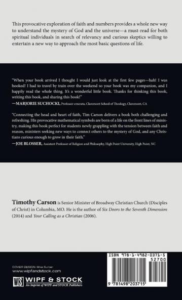 This provocative exploration of faith and numbers provides a whole new way to understand the mystery of God and the universe--a must-read for both spiritual individuals in search of relevancy and curious skeptics willing to entertain a new way to approach the most basic questions of life. When your book arrived I thought I would just look at the first few pages--hah! I was hooked! I had to travel by train over the weekend so your book was my companion and I happily read the whole thing. Its a wonderful little book. Thanks for thinking this book writing this book and sharing this book! --Marjorie Suchocki Professor Emerata Claremont School of Theology Claremont CA Connecting the head and heart of faith Tim Carson delivers a book both challenging and refreshing. His provocative mathematical symbols are born of a life on the front lines of ministry making this book perfect for students newly grappling with the tension between faith and reason ministers seeking new ways to connect others to the mystery of God and any Christians curious enough to grow in their faith. --Joe Blosser Assistant Professor of Religion and Philosophy High Point University High Point NC Timothy Carson is Senior Minister of Broadway Christian Church (Disciples of Christ) in Columbia MO. He is the author of Six Doors to the Seventh Dimension (2014) and Your Calling as a Christian (2006).