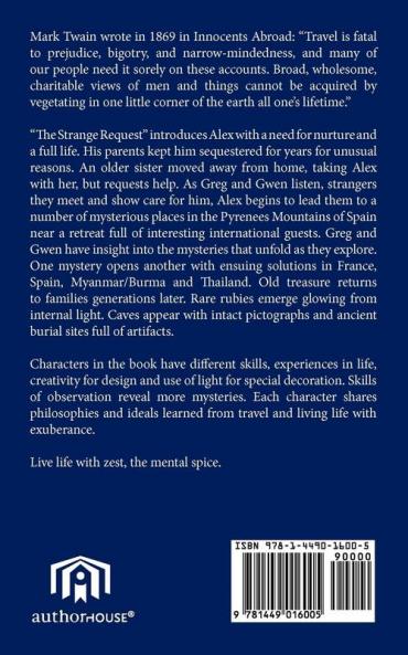 Mark Twain wrote in 1869 in Innocents Abroad: Travel is fatal to prejudice bigotry and narrow-mindedness and many of our people need it sorely on these accounts. Broad wholesome charitable views of men and things cannot be acquired by vegetating in one little corner of the earth all one's lifetime.? The Strange Request introduces Alex with a need for nurture and a full life. His parents kept him sequestered for years for unusual reasons. An older sister moved away from home taking Alex with her but requests help. As Greg and Gwen listen strangers they meet and show care for him Alex begins to lead them to a number of mysterious places in the Pyrenees Mountains of Spain near a retreat full of interesting international guests. Greg and Gwen have insight into the mysteries that unfold as they explore. One mystery opens another with ensuing solutions in France Spain Myanmar/Burma and Thailand. Old treasure returns to families generations later. Rare rubies emerge glowing from internal light. Caves appear with intact pictographs and ancient burial sites full of artifacts. Characters in the book have different skills experiences in life creativity for design and use of light for special decoration. Skills of observation reveal more mysteries. Each character shares philosophies and ideals learned from travel and living life with exuberance. Live life with zest the mental spice.