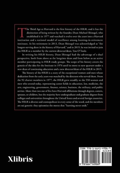 The Third Age At Harvard Is The First History Of The Hilr And It Has The Distinction Of Being Written By The Founder Dean Michael Shinagel Who Established It In 1977 And Watched It Evolve Over The Years Into A Harvard Institution And A National Model Of Excellence Among Learning-In-Retirement Institutes. At His Retirement In 2013 Dean Shinagel Was Acknowledged As ?The Longest-Serving Dean In The History Of Harvard? And In 2019 He Was Invited To Join The Hilr As A Member By The Current Director/Dean Tess O?Toole. In Writing His Hilr History Dean Shinagel Had The Advantage Of A Dual Perspective Both From Above As The Longtime Dean And From Below As An Active Member Participating In Hilr Study Groups. The Scope Of His History Covers The Genesis Of The Idea For The Institute In 1976 Until Its Move To New Quarters Under A New Dean Of Continuing Education And A New Director/Dean Of The Hilr In 2015. The History Of The Hilr Is A Story Of The Exceptional Women And Men Whose Dedication From The Early Years Was Matched By The Directors Who Served Them. From The 92 Charter Members In 1977 The Hilr Grew Steadily To The 550 Women And Men Who Attend Today Representing Career Fields In Education Law Medicine The Arts Engineering Government Finance Science Business The Military And Public Service. More Than Two Out Of Five Have Harvard Affiliations Through Degrees Careers Spouses Or Children But The Majority Have Undergraduate And Graduate Degrees From Colleges And Universities Throughout The United States And Several Foreign Countries. The Hilr Is Diverse And Cosmopolitan In Every Sense Of The Word And The Members Are Sui Generis: They Epitomize The Motto That ?Learning Never Ends.?