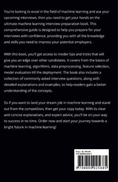 500+ Topic wise, beginners to advance level, thoughtfully articulated Machine Learning interview questions and answers. [It's one of the largest fine articulated interview questions and answers bank]This book is designed to provide a comprehensive guide for anyone who is preparing for a machine learning interview. It covers a wide range of topics, including the basics of machine learning, algorithms, data preprocessing, feature selection, model evaluation till the deployment. The book also includes a collection of commonly asked interview questions, along with detailed explanations and examples, to help readers gain a better understanding of the concepts.The first section provides a fundamental understanding of machine learning and covers the high-level essential concepts that one needs to know before diving deep into each individual topic. The later individual chapters dive into more details from beginner level interview questions to advance level.This book is not only for individuals who are preparing for interviews but also for those who want to expand their knowledge of machine learning. It can be used as a self-study guide or as a supplementary resource for students who are studying machine learning in college. It can be a very handy book for interviewers for quick candidate evaluation.Prepare and boost you confidence to land on you dream job!Best of Luck!!