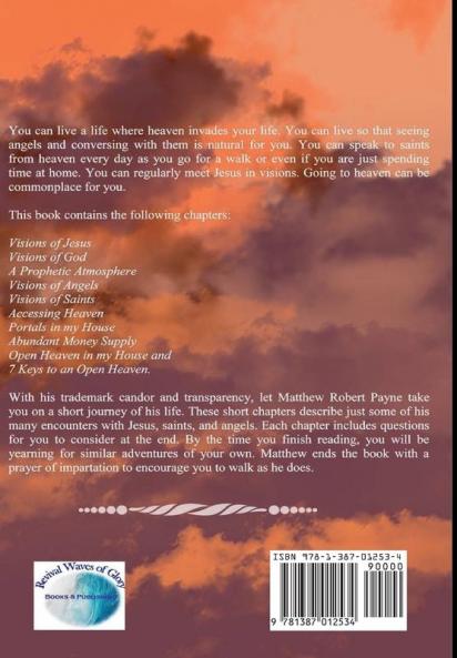 You can live so that heaven invades your life. You can live so that seeing angels and conversing with them is natural for you. You can speak to saints from heaven every day as you go for a walk or even when you are just spending time at home. You can regularly meet Jesus in visions. Going to heaven can be commonplace for you.This book contains the following chapters: Visions of JesusVisions of GodA Prophetic AtmosphereVisions of AngelsVisions of SaintsAccessing HeavenPortals in my HouseAbundant Money SupplyOpen Heaven in my House andSeven Keys to an Open Heaven.With his trademark candor and transparency let Matthew Robert Payne take you on a brief journey of his life. These short chapters describe just some of his many encounters with Jesus saints and angels. Each chapter includes questions for you to consider at the end. By the time you finish reading you will be yearning for similar adventures of your own. Matthew ends the book with a prayer of impartation to encourage you to walk under an open heaven as he does.