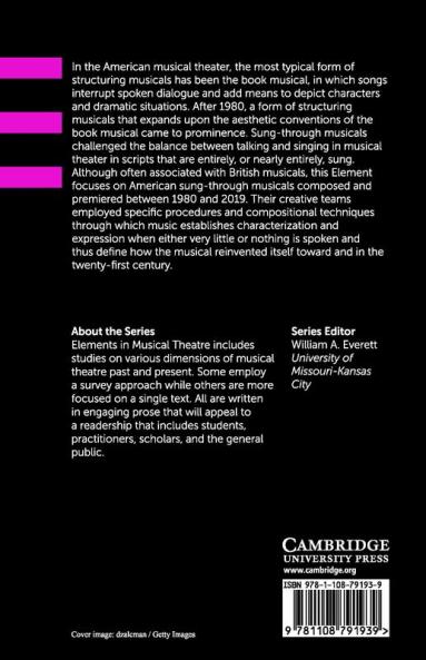 In the American musical theater the most typical form of structuring musicals has been the book musical in which songs interrupt spoken dialogue and add means to depict characters and dramatic situations. After 1980 a form of structuring musicals that expands upon the aesthetic conventions of the book musical came to prominence. Sung-through musicals challenged the balance between talking and singing in musical theater in scripts that are entirely or nearly entirely sung. Although often associated with British musicals this Element focuses on American sung-through musicals composed and premiered between 1980 and 2019. Their creative teams have employed specific procedures and compositional techniques through which music establishes characterization and expression when either very little or nothing is spoken and thus define how the musical reinvented itself toward and in the twenty-first century.